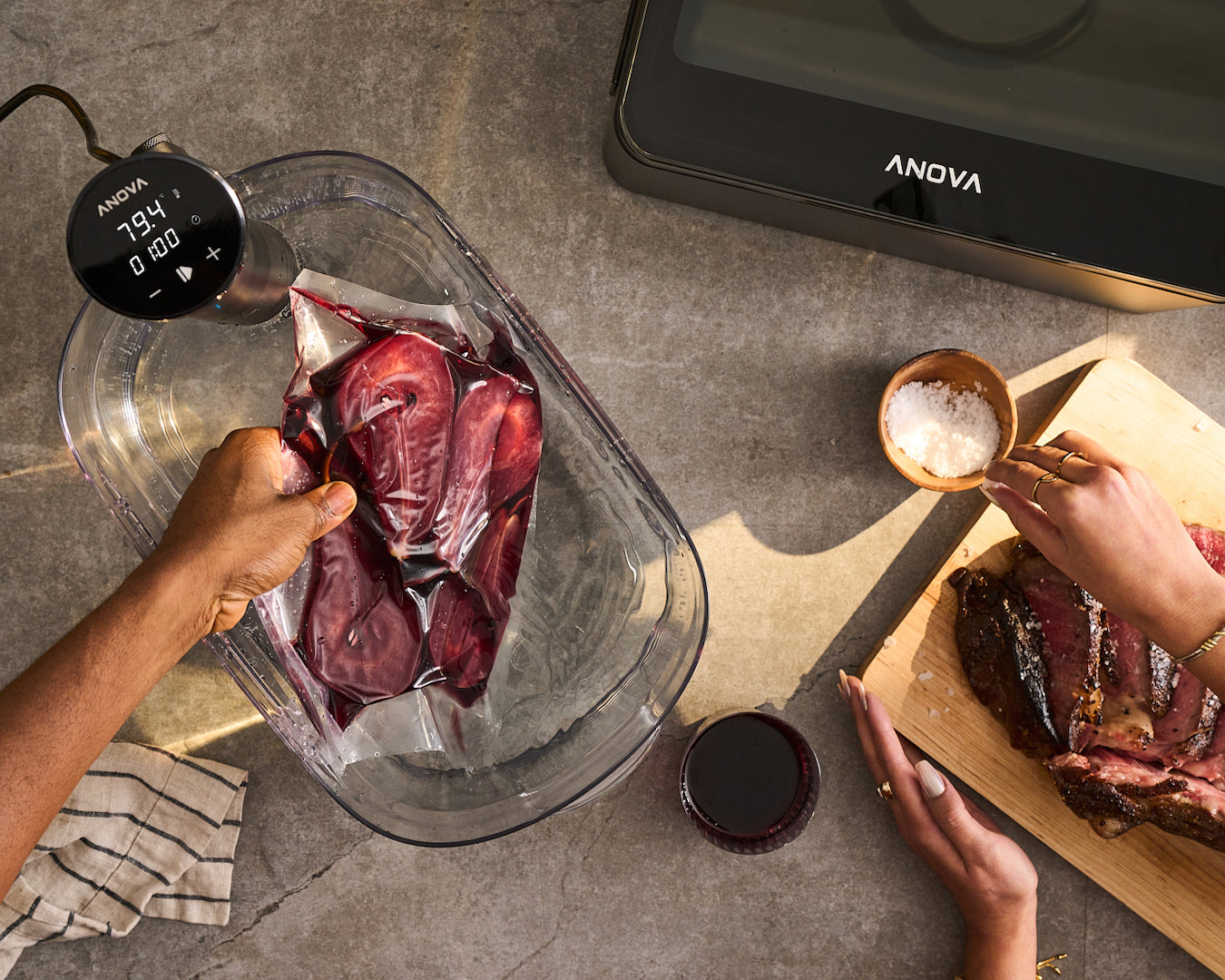 Our Anova Precision™ vacuum sealer works fast, with a strong seal. It's perfect for sous vide cooking and food storage – and it’s small enough to stash away.