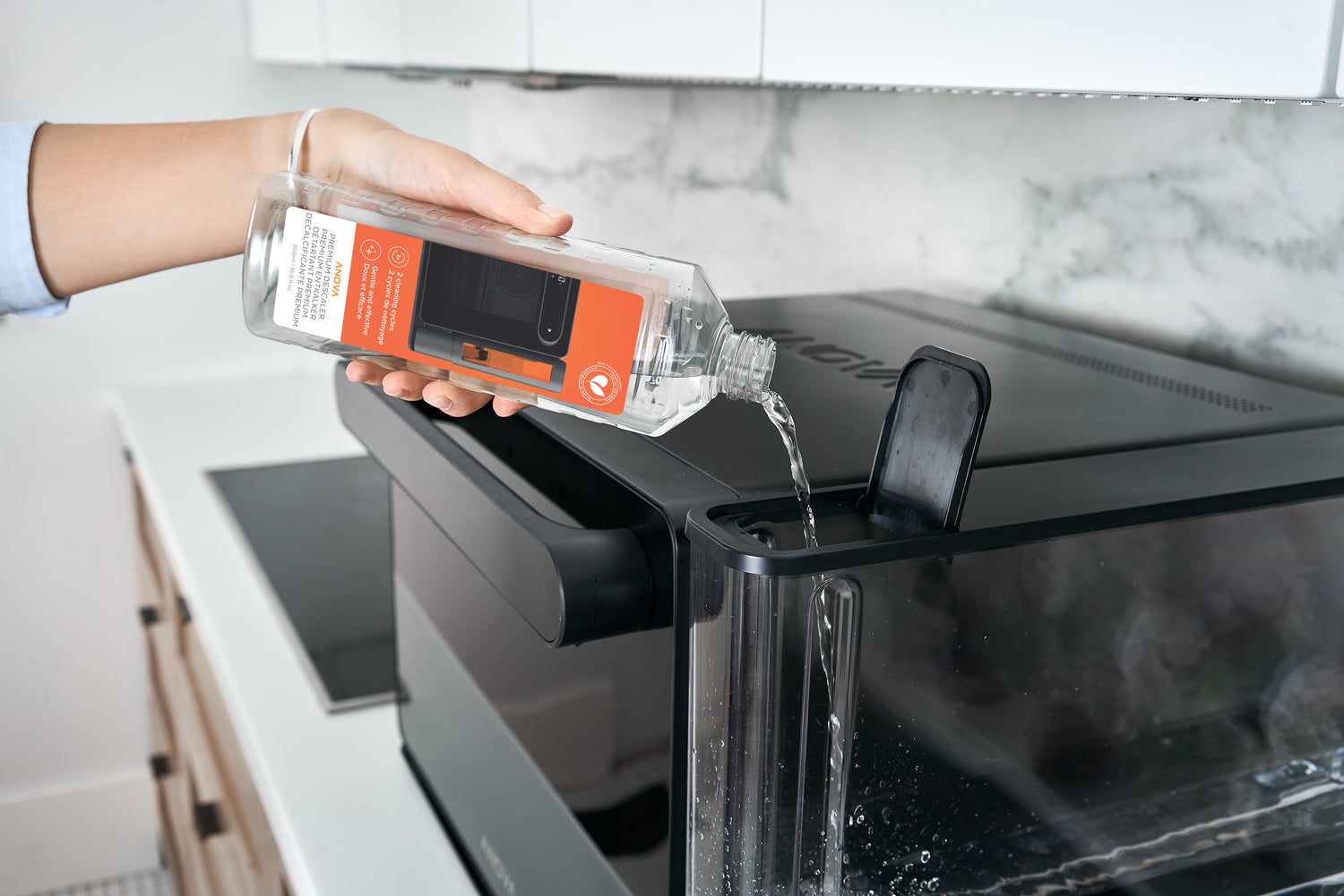 Anova Precision™ Oven Kalkinpoistoaine poistaa nopeasti ja helposti kalkin ja kovan veden kertymät lisäämällä kalkinpoistoaine ja vesi uunin vesisäiliöön ja ajamalla kone läpi esiohjelmoidun kalkinpoistojakson.