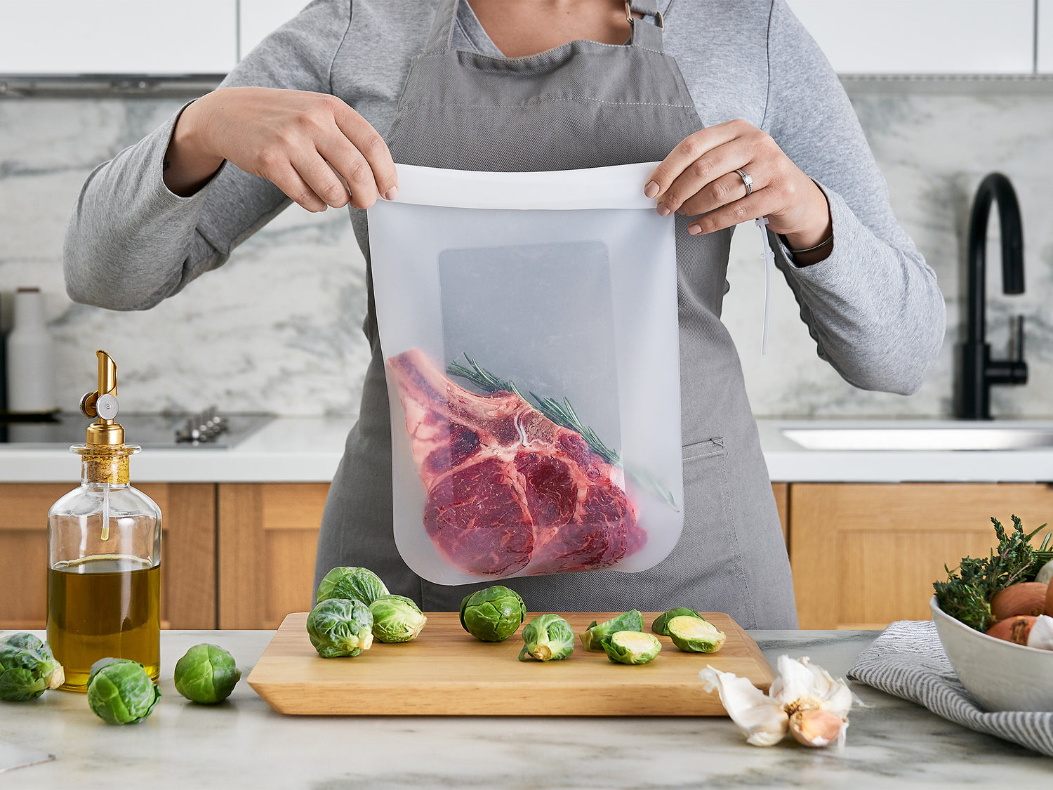 Easily remove air from the bag by hand and roll the top to close. Secure the closure with the pull tie and you’re ready to cook.